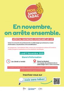 PRENDRE RENDEZ-VOUS ACTUALITÉS Mois Sans Tabac | Lundi 3 novembre 2025 Coups de cœur de la médiathèque 2025 Carte blanche aux médiathèques 2025 Trouver un médecin Trouver une consultation Mots clés Hôpital Hôpital Choisir un Hôpital... Raymond-Poincaré AP-HP.UNIVERSITE PARIS SACLAY Payer en ligne L’hôpital Raymond-Poincaré est un lieu de santé sans tabac Diminuer ou arrêter votre consommation de tabac Voir les conseils de nos professionnels en vidéo